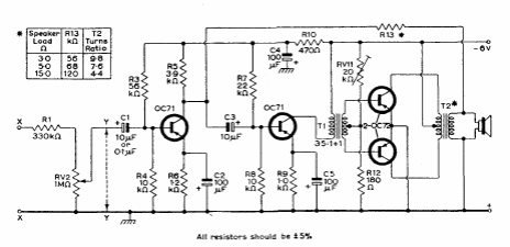 This old amplifier uses germanium transistors from the time. The circuit is from a Mullard transistors manual from 1960. Power is supplied with 6 V.