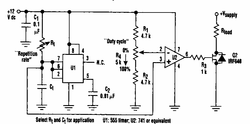Found in an Electronic Design from the 90's, this circuit generates signals with a controlled active cycle. The frequency depends on the capacitor with no indicated value and the potentiometer setting with the 555.