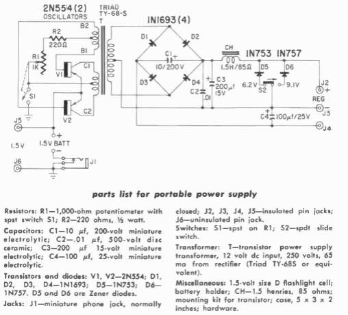 This power supply with a power inverter was found in a documentation on transistors from 1960. The transistors are made of germanium from the time. The power supply is stabilized by zener diodes.