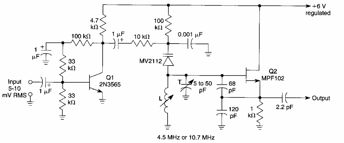 This circuit generates an FM signal of 4.7 or 10.7 MHz for audio signals on analog TV or FM, with the purpose of carrying out tests and adjustments. The circuit is from an American documentation from the 90s.