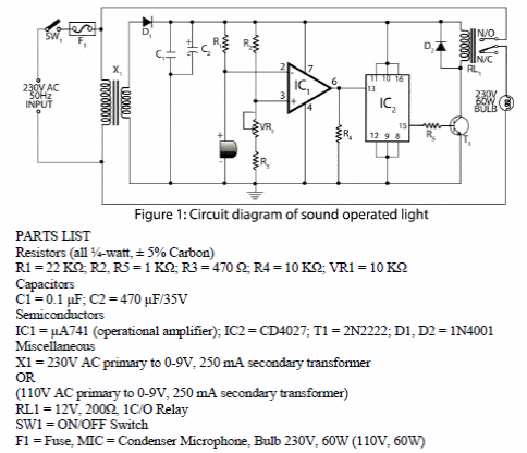 This voice-actuated bistable relay or sonic switch was found in English documentation. The circuit uses sensitive 12V relay and the microphone is electret type.
