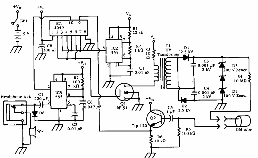 Found in old documentation, this meter has a high voltage inverter for the Geiger tube. The circuit provides signals to a headset.