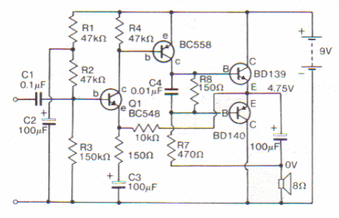 The indicated fraction watt amplifier has good gain, requiring only 100 mV input for full power excitation.