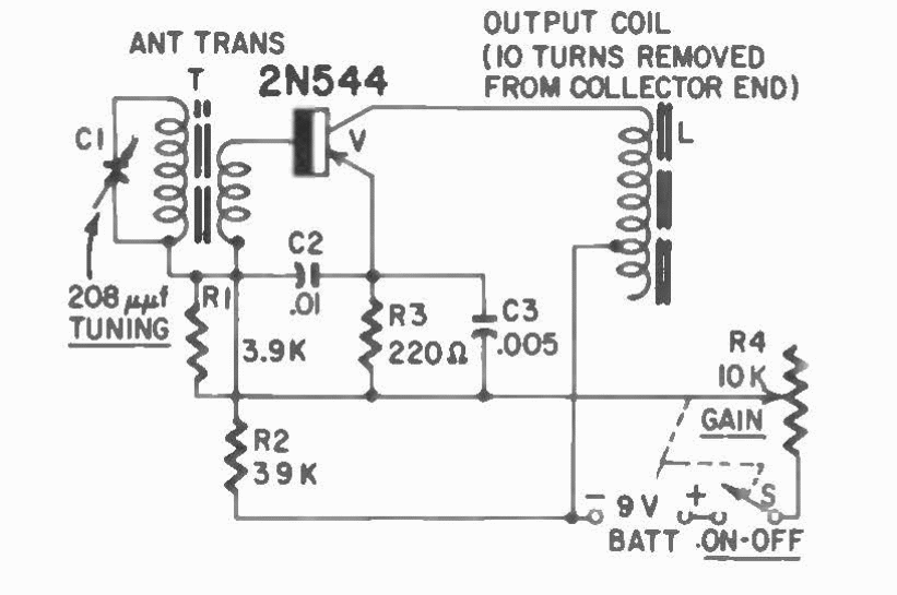 Found in a publication by Gernsback from 1960, this circuit uses germanium transistors of the time and commercial coils. It can be changed to operate with modern transistors and other wavebands.
