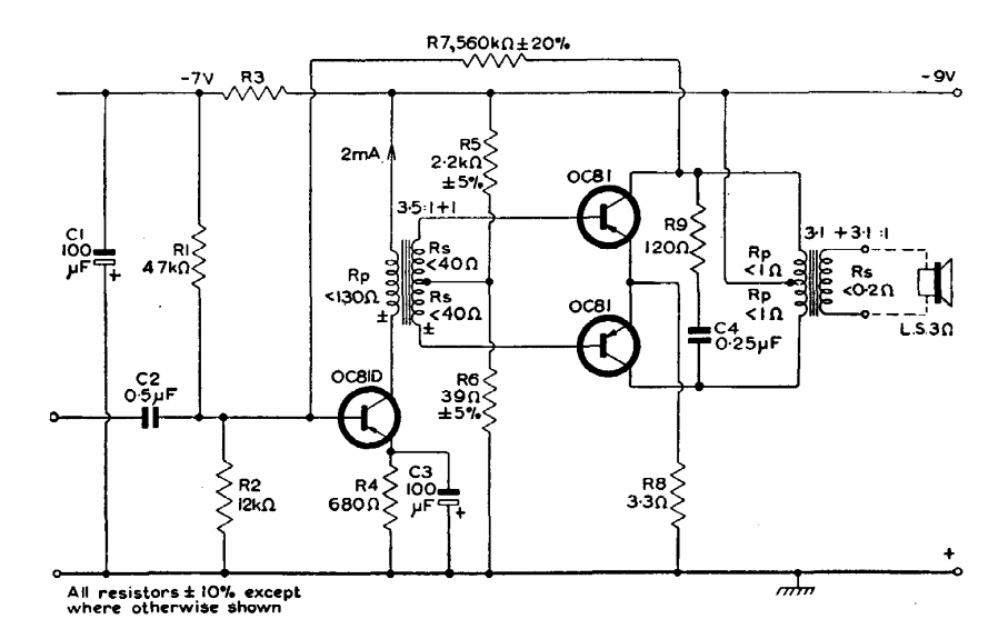 This circuit with 1W of output was found in a Mullard manual from 1960. The consumption is low and germanium transistors of the time are used.