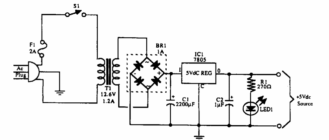 In the figure we have a simple 5 V power supply obtained from an American documentation from the 90's. The integrated circuit must be equipped with a heat radiator.
