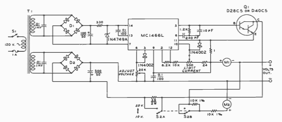 This current-limited variable power supply was found in 1977 book. The diodes are according to current which is on the order of 200 mA only.