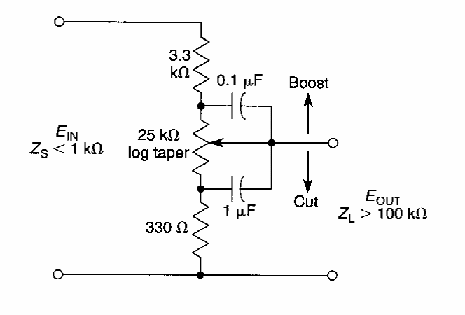 This circuit with losses of 20 dB at 350 Hz was found in older documentation, but it applies to modern preamp and amplifier circuits.