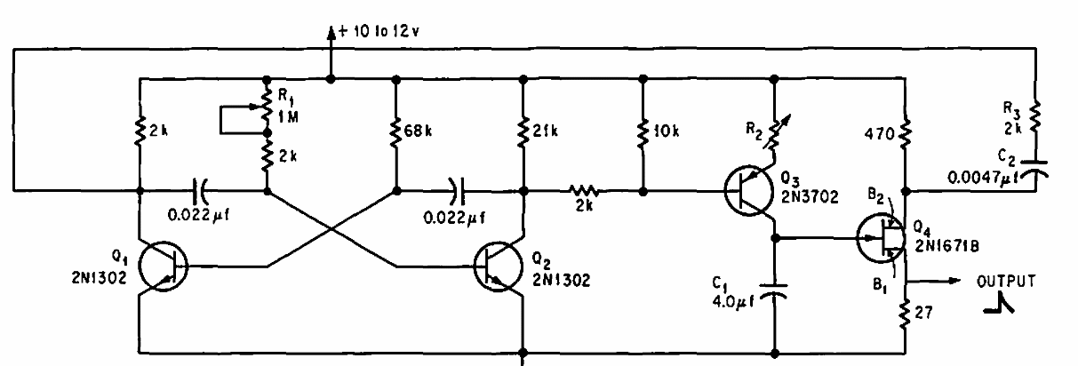 This circuit was found in a 1967 publication. Transistors can be modern general purpose. Component values can be changed for other timings.