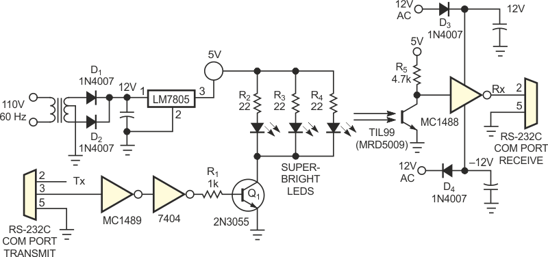 Based on the MC1488 or MC1489 operational amplifiers, this circuit has a 5000V isolation driving a 2N3055 transistor for a high-power signal. The receiver is a common phototransistor.