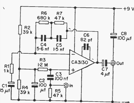 Using the CA3130, this NAB EQ preamp has excellent gain. The power supply does not have to be symmetrical.