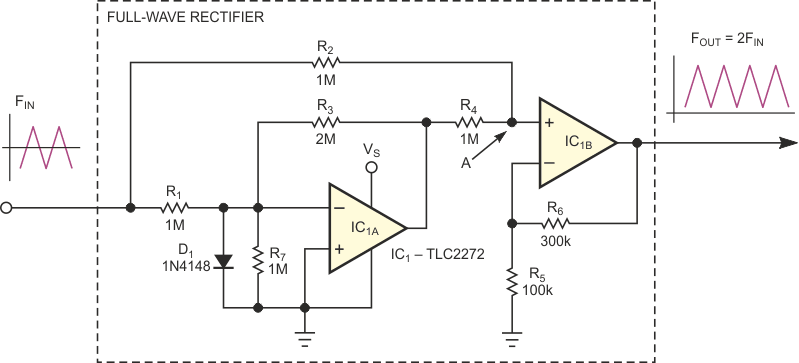 The purpose of the circuit below, based on the Texas Instruments TLC2272, is to double the frequency of a triangular signal. The maximum frequency is on the order of 20 kHz for the operational, but another type can be used for higher frequencies.