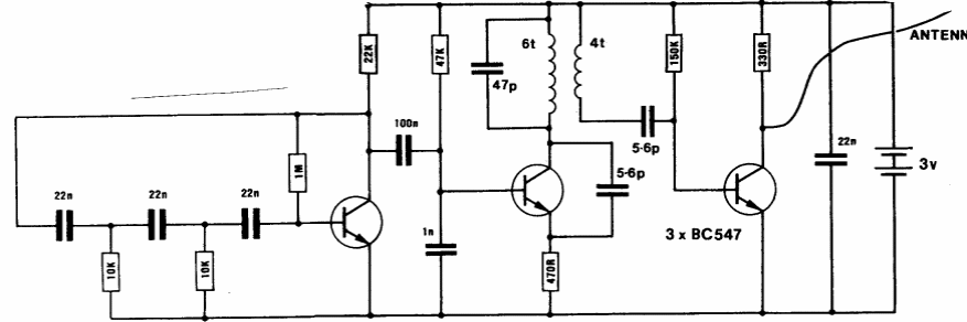 This transmitter emits a modulated signal at a frequency given by the first transistor in the phase shift oscillator. The circuit is from an Australian publication from 1991.