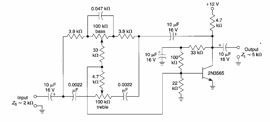 This active tone control circuit was found in American documentation from the 90's. The transistor can be general purpose or low noise with high gain.
