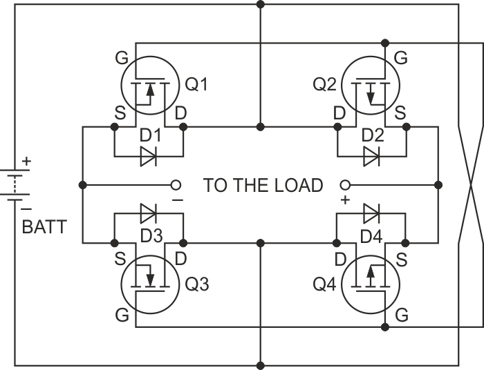 In the figure we have an interesting protection bridge against power polarity inversion of a circuit using power MOSFETs. MOSFETs must have currents according to the protected load.