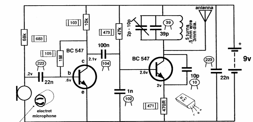 Found in an Australian documentation from 1991, this circuit was sold in a kit at the time. It is a small FM transmitter with a very common configuration, also found in other projects on this site.