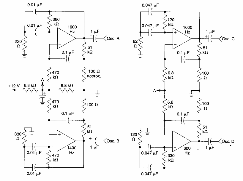Using 4 operational amplifiers this circuit generates 4 different tones. The circuit is from an American documentation from the 90's. Operational amplifiers are tTL084.