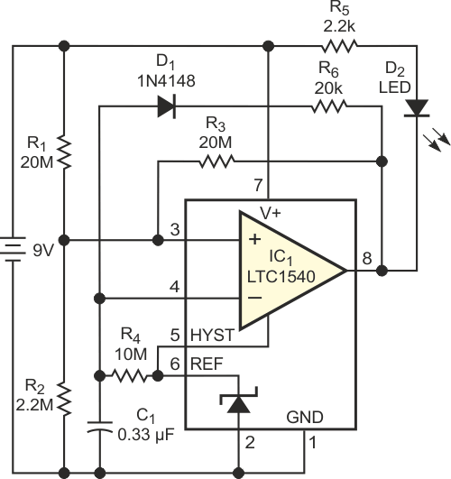 Based on an Analog Devices LTC1540, this circuit consumes only 50 uA, serving to monitor the status of a 9 V x 450 mA battery. The circuit turns on an LED when the battery voltage drops below 6.5V.