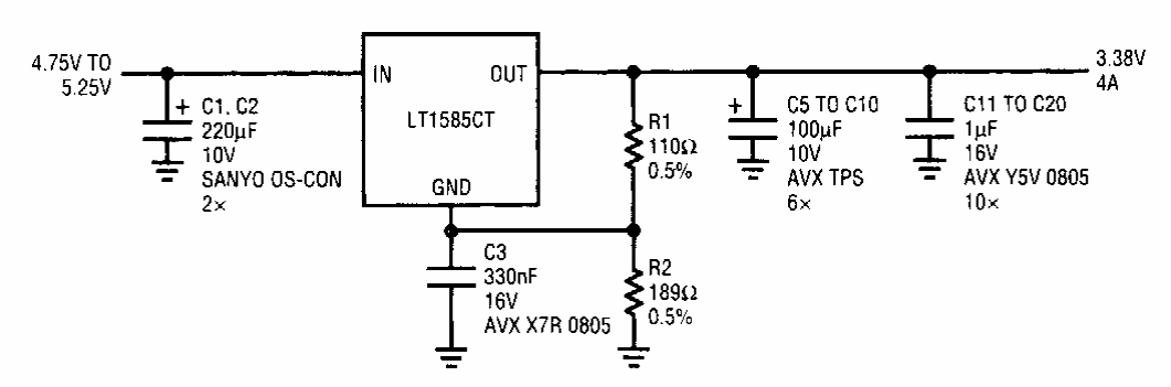 Found in a Linear Technology documentation from the 1990s, this circuit has the voltage adjusted by resistors R1 and R2 according to the formula given in the diagram.