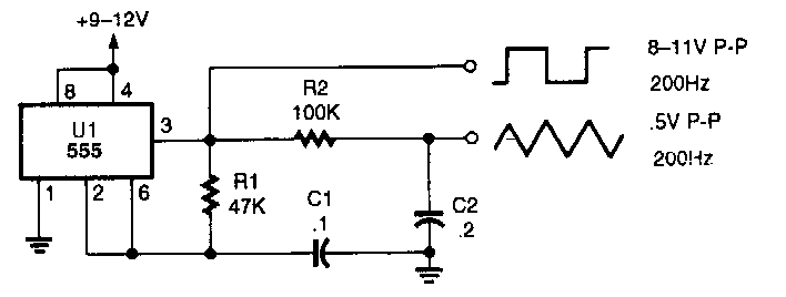 This circuit, based on a 555, was found in a Popular Electronics from the 90s. The circuit has the frequency determined by R1, R2 and C1.