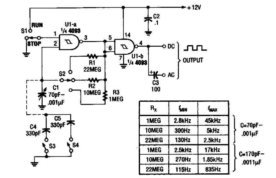 This variable frequency oscillator with the 4093 was found in a Popular Electronics from the 90s. The table gives the component values for various frequency ranges.