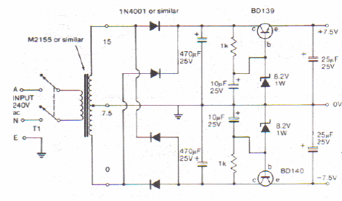 By changing the zener, other output voltages can be obtained for this symmetrical power supply. With the transistors indicated the maximum current is in the order of 500 mA.