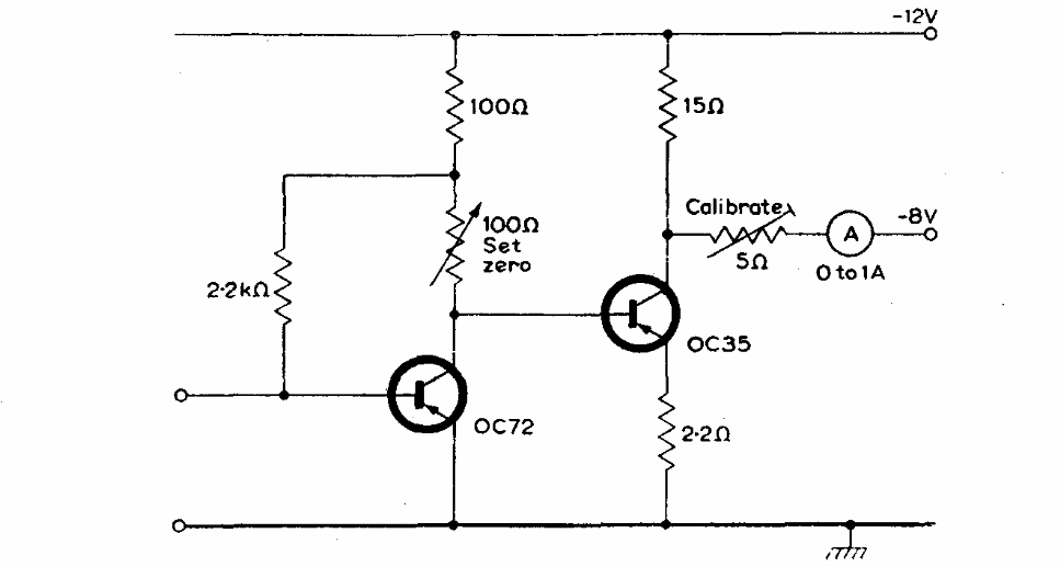 This amplifier circuit with two transistors was found in a Mullard transistor manual from 1960. The circuit has a maximum output current of 1.3 A.