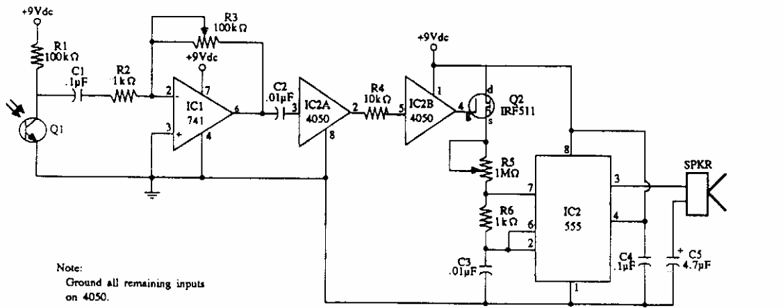 Found in American documentation from the 90s, this circuit serves as a laser receiver and also as a toy sound effects generator.