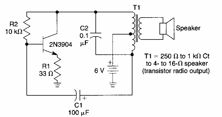 Found in an American documentation from the 90s, this circuit makes use of an output transformer for transistors, working with a 6 V power supply.