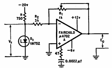 This circuit was obtained from an old American publication. The uA702 is a differential amplifier and the diode is a zener.