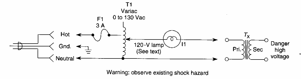 This test circuit for transformers connected to the power grid makes use of a variac. We found it in an old American documentation.
