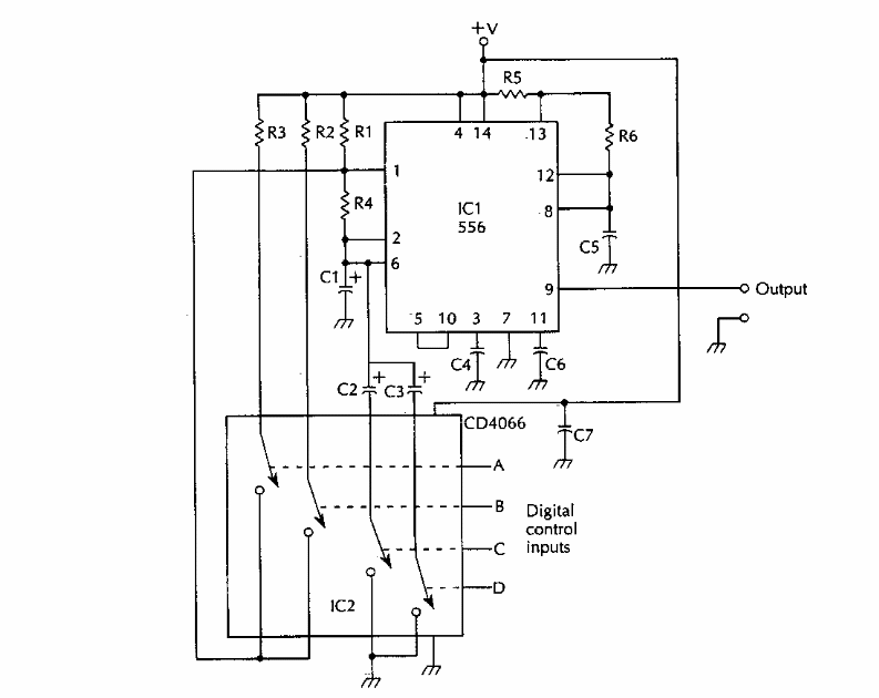 Found in American documentation from the 90s, this circuit generates sound bursts according to the digital control.