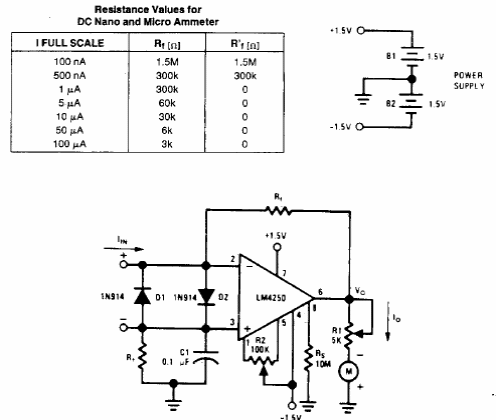 Found in documentation by National Semiconductor from the 1990s, this circuit measures currents in the order of nanoamps as shown in the table next to the diagram.