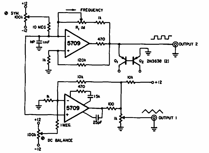 Found in older Signetics documentation, this circuit generates signals from 30 Hz to 25 kHz. Operational amplifiers are from the time, as is the matching pair of transistors.
