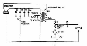 Found in an American publication on transistors from the 60's, this circuit uses a transistor radio transformer and a germanium transistor of the time. Capacitors determine frequency.