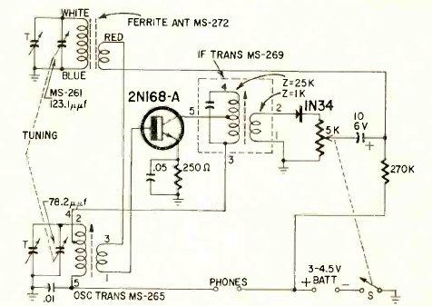 This interesting circuit with just 1 transistor was published in Radio Electronics magazine in December 1960. The characteristics of the coils were not given, but the receiver is for the medium wave range.