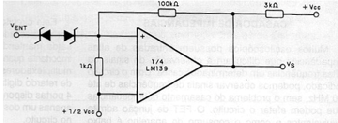 This VCO works in the opposite way to the previous circuit, converting direct voltages into frequencies. In this circuit, the two zener diodes, which must be equal, fix the operating point of the voltage comparator. The main disadvantage of this circuit is the inability of the zener diodes to operate with voltages lower than 1 V.
