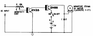 This circuit was obtained from an American publication from the 60's. The transistors are germanium types of the time and the motor, with the transistor used, is only 15 mA.
