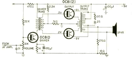This power stage with two counterphase transistors and coupling transformers was shown in Radio Electronics magazine in September 1961. The transistors were common types at the time.