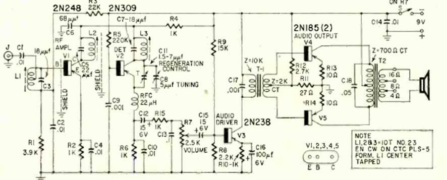 This 5-transistor receiver was obtained from an article in the February 1969 Radio Electronics magazine. The circuit has a class B audio stage and 3 transistors in the previous stages, presenting a good gain at 30 MHz.
