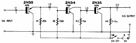 This circuit was obtained from an old American publication. Transistors are germanium types of the time. The input impedance is 200k and the voltage gain is 50 times or 34 dB.