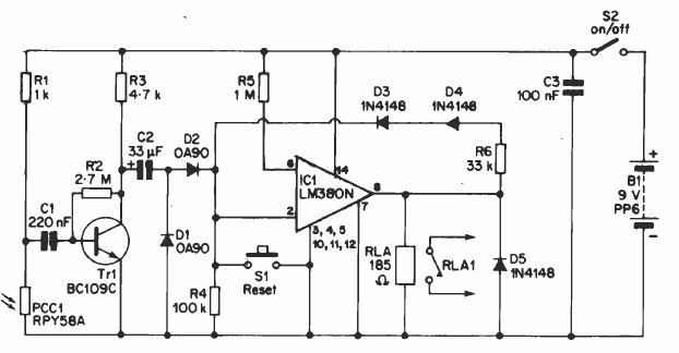 This circuit only detects variations in light falling on the sensor. The circuit uses an LM380 as a base, having been found in documentation from the 90's. The sensor is an LDR.