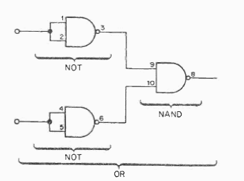 In the figure we have the way to configure an OR gate using 3 gates of the 7400. The circuit is TTL and must be powered with 5 V.