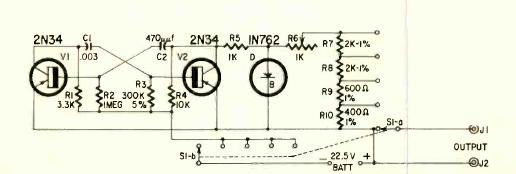 This circuit generates signals with precise intensities for oscilloscope calibration. The circuit, with transistors of the time, was published in Radio Electronics magazine in July 1961.