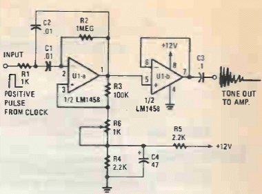 This circuit generates a tone of a bell and can be used in this type of application. The circuit is from a Popular Electronics from 1992.
