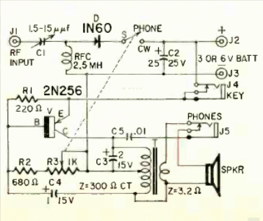 This oscillator for telegraphy practice was published in Radio Electronics magazine in March 1958. The transformer is the type normally used in the output of transistor radios.
