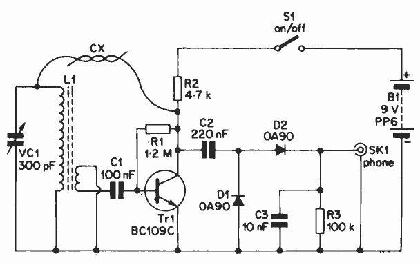 This receiver was found in old English documentation and any general purpose NPN transistor can be used. The coil has 8 turns primary and 10 turns secondary, using 28-wire on a ferrite rod.