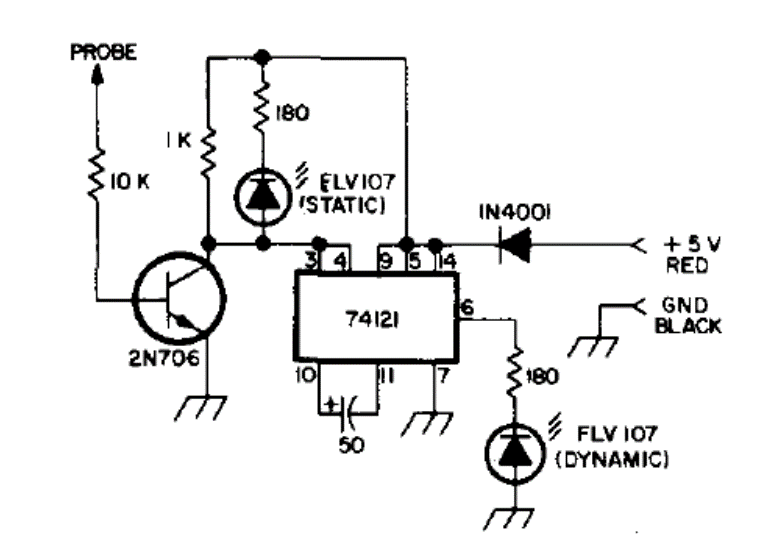 We found this configuration in a technical documentation from 1974. It can test both TTL logic circuits and older versions such as RTL. The circuit must be powered with 5 V obtained from the circuit being analyzed. The transistor can be the BC548.