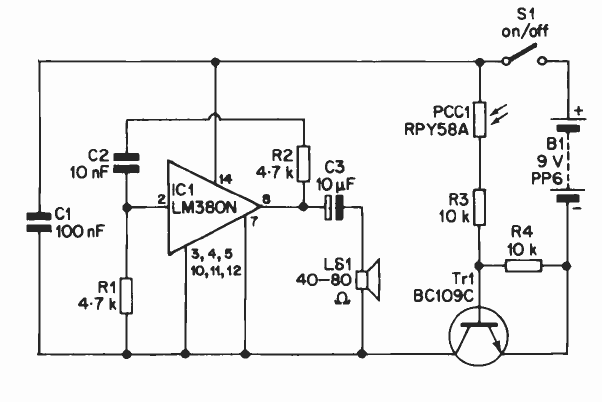 This circuit triggers an LM380 oscillator, producing an audio tone with light falling on the LDR. The circuit is from an old publication and the transistor could be the BC548.