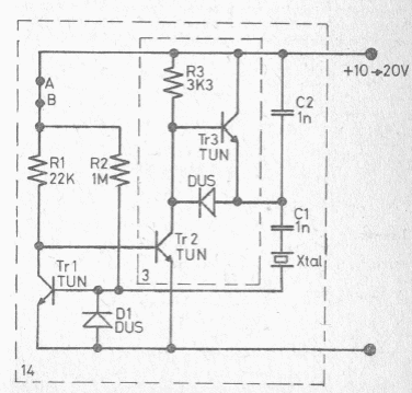 This circuit uses a ceramic transducer to emit ultrasound whose frequency depends on C2. The circuit was found in an English publication from the 80's. The components admit equivalents.